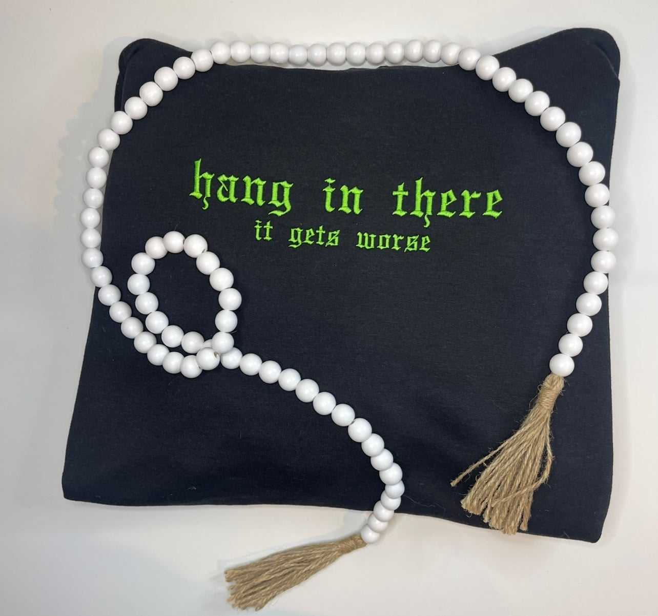 Stay cozy and stylish with our beautiful 'Hang In There, It Gets Worse' embroidered sweatshirt. Featuring a bold, intricate design, this sweatshirt brings a mix of humor and comfort to your wardrobe. The soft fabric and carefully crafted embroidery make it the perfect choice for both lounging and making a statement. Embrace the cozy vibes with a little bit of attitude—this sweatshirt is a must-have for those who appreciate a touch of wit with their warmth.
